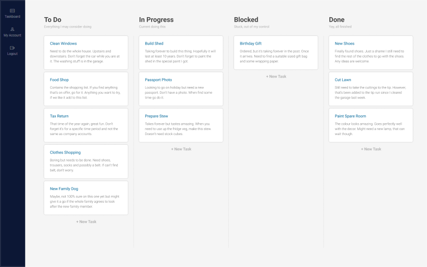 Unload everything out of your head and remove the burden! List all your actionable tasks, identify any due dates and tasks that often repeat. Group them (into boards), with individual statuses for example; “To Do”, “In Progress”, “Done”. Easy.